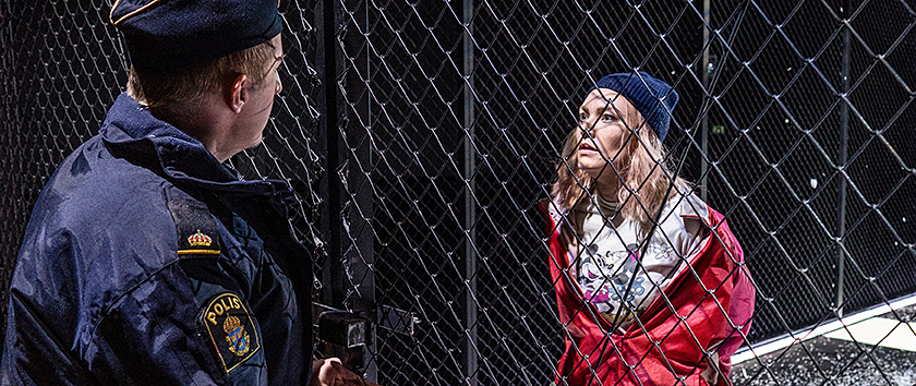 Plötsligt var vi själva i myllret på en flyktinguppsamlingsplats. Massor av folk i ett trångt utrymme. In kom två beväpnade poliser med hund, oavbrutet stressande och skrikande i megafoner att vi skull vara beredda med våra papper och att vi skulle flytta oss. Vi var i ett slag där, och det var nu. Det gällde oss! Vi blev bryskt indragna i händelserna. Det kanske låter som effektsökeri i en operaföreställning, men det funkade bra.