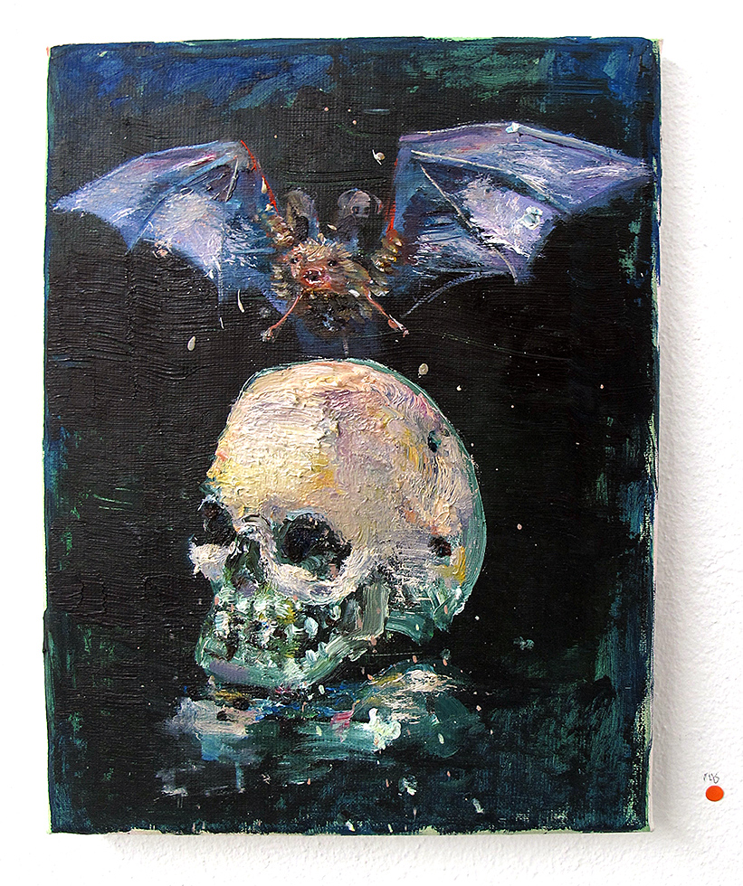 I första rummet, när jag är på bästa operahumör gör sig döden påmind mitt på stora dan i utställningsglammet. Djävla Olle Schmidt. Så fort man tagit sitt fotbad och mår som en prins får hans bilder en att kliva på ett rostigt häftstift. Mitt i svartaste natten när man ska sova hålls man vaken av ett grinande schmidtkranium. Som om inte allt redan var nattsvart och olustigt sitter en fladdermus på dess huvud. Inte är det en död i skönhet precis. Som alltid i Olle Schmidts målningar får man se nåt man väl egentligen inte vill se, upplever man nåt som stör och förstör. Och sånt finns det gott om i vår tid, både före och efter döden. Samtidskonst alltså. Vilken kanonmålning!