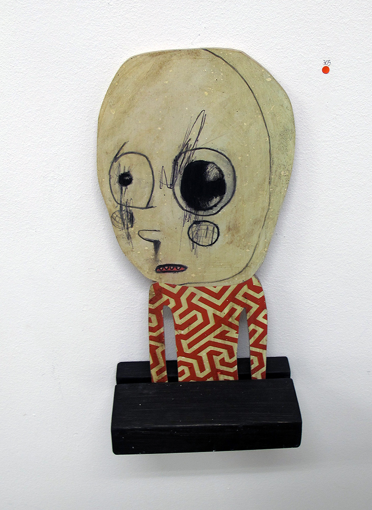 Jag skyndar vidare. Nere vid golvlisten ser man en stukad kille. Han ser med förlov sagt ledsen ut. Hans blick är som ett öppet sår. Och detta trots att han har sin finaste och mest konstfulla skjorta på sig. Han ser litet bortkommen ut här på fina galleriet. Sådana är dom Samot Nosslins figurer. Bilden gjord på en figursågad skiva som blivit över nånstans i livet och får nytt och udda liv i konstens värld. Samot Nosslins bilder väcker känslor av omtanke och empati. Sånt behövs i dessa yttersta dagar. Samtidskonst alltså. Vilken kanonmålning!