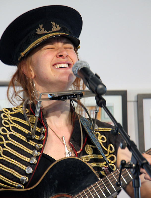 Till det kommer att hon är ett enmansband som inte lämnar något övrigt att önska. Hon är en grym gitarrist. Hon spelar i en genommusikalisk fingerpickingstil. Det kan vara ömsint och försynt. Eller så river hon av en blues så man får ståpäls på armarna. Hon har ett munspelsställ om halsen och spelar solo också på det emellanåt. Och så har hon en fottamburin på ena foten och så stampar hon takten med den andra.
