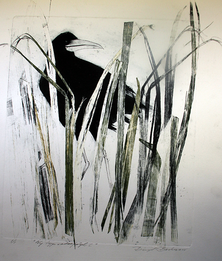 Hennes motiv den här gången är mest människor och djur. Det finns en serie med fåglar. Flera av bladen är gjorda i blandade grafiska tekniker. Fåglarna är som regel frilagda ur schellackbehandlad papp. Det kallas collografi ibland, men Birgit Backman föredrar beteckningen pappografi. Bilden trycks sedan en gång till med ett mönster som uppstått genom att hon lagt växtdelar, det kan t ex vara kirskål eller rölleka, på i färgen som fått ge ett mönster och sedan har hon tryckt en andra gång. Det blir litet annorlunda mönster som går fint ihop med fåglarna. Den här motivmässiga dubbelexponeringen känns lekfull och nyfiken och, och det är det viktigaste, bra bilder. Det slumpmässiga mötet mellan växter som fanns till hands och fågelbilderna skapar spännande och ibland vackra bilder. Som hon jobbar med den här tekniken blir det upplaga 1 på de grafiska bladen.