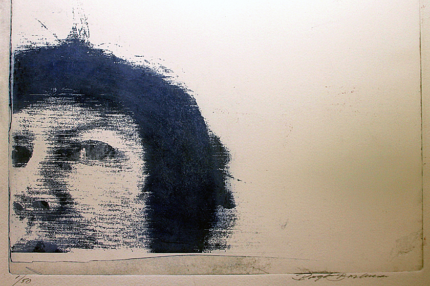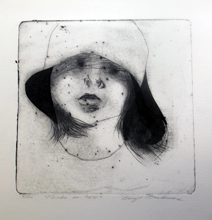 Flicka med hatt är ett motiv hon jobbat med. En är gjord i pappografi (collografi), och en, den som jag tycker bäst om, är gjord som torrnål. I den har hon bearbetat plåten med sand som gör ytan litet mystisk på ett sätt som ökar spänningen i tillägnelsen. Jag tycker mycket om uttrycket i flickans ansikte och hela bildens attityd.