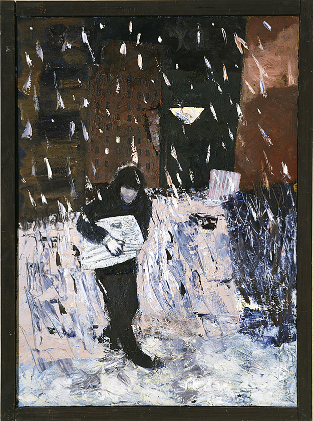 Man bläddrar vidare och kommer till hennes bild 02.15. Det är bilden av ett ensamt tidningsbud i natten. Tänk att en målning kan väcka så många tankar och känslor, om målmedvetenhet trots allt, om köld, ensamhet och medkänsla. Och uttrycket i snötäcket och snön är måleriska uttryck i toppklass.