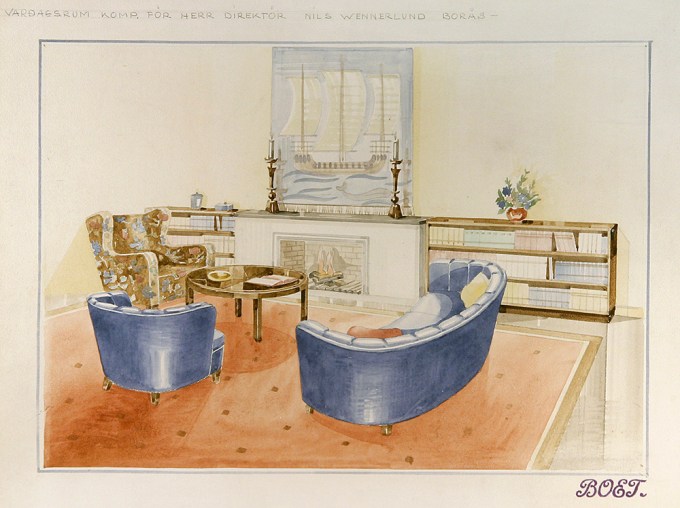 Otto Schultz och Boet deltog inte i de stora mässorna och slapp därför recensioner och jämförelser. Han hade i stället sin egen tidskrift. Han är en bortglömd kuriositet i designhistorien och jag har lätt att förstå varför. Men han skriver in sig genom att efterlämna massor med akvareller av inredningar han gjort och som finns i Röhsska museets samlingar och då blir det lätt att forska och göra utställningar.