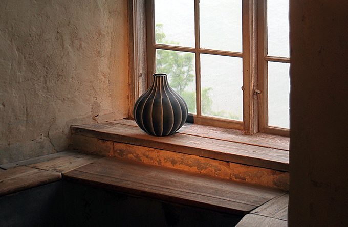 I ett litet fönster mot en vidunderlig utsikt från slottet står en vas av Ingegärd Råman. Det blir ett slags installation i stillebenform som är bedövande vacker.