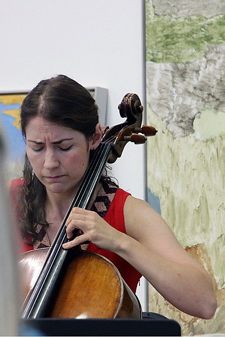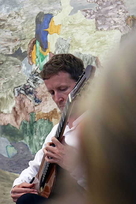 På festivalens andra dag fick vi stå i kö för att komma in i Andreas Erikssons stora studio som var spelplatsen för måndagens konsert. Det blev ett möte av musik och bildkonst av högsta karat, en perfekt miljö för konstnärliga upplevelser. Andreas stora målningar, på väg till en stor internationell utställning, hängde längs väggarna i den enorma studion och gav liv och djup åt spelplatsen.