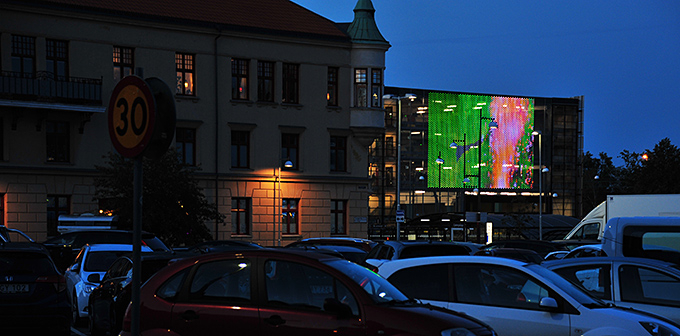 Lördagen fortsatte på kvällen i Skövde med invigningen av Pipilotti Rists stora offentliga videokonstverk på fasaden av Mobilitetshuset Mode, lika med P-hus på gammelsvenska, precis vid Resecentrum i Skövde och nära Kulturhuset.