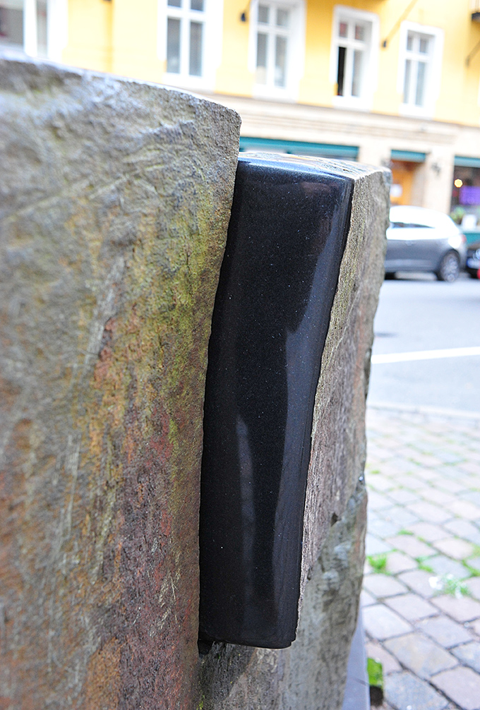 Lite längre upp på Kastellgatan 7 står det en stor stenskulptur, om man tittar närmare på den så ser man ett stycke polerad sten, som man kan spegla sig i.