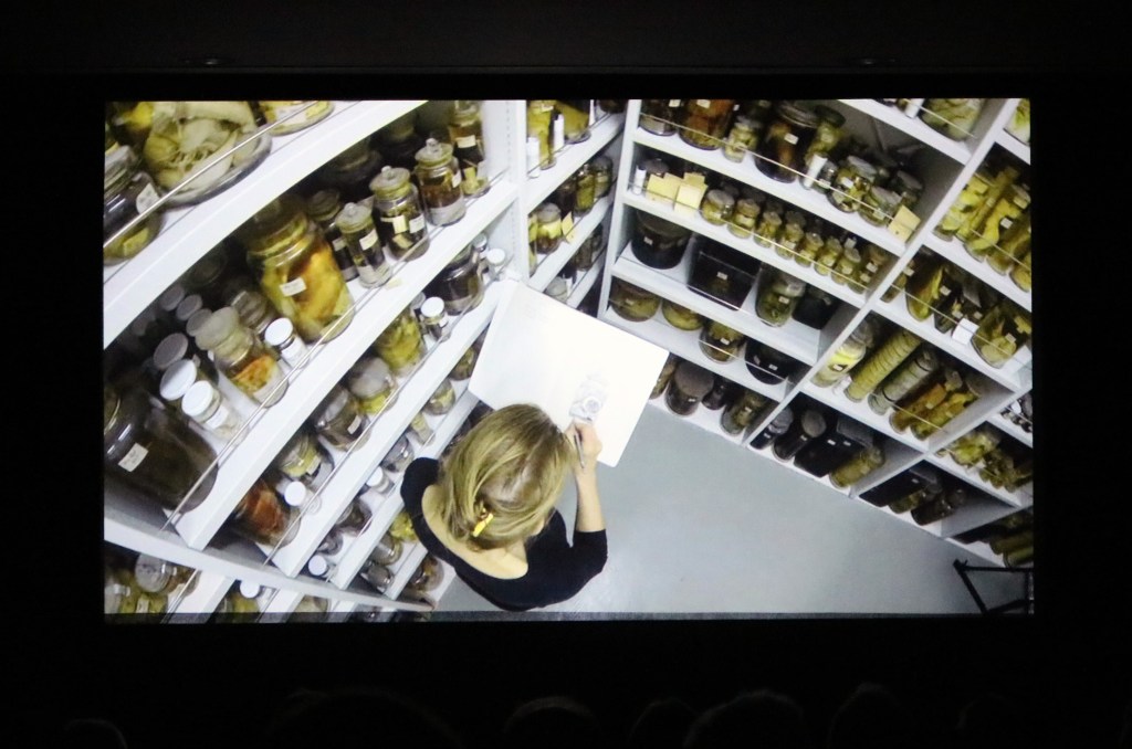 Vernissagen inleddes med filmen ”Kropparnas arkiv” av Christina Olofsson. Hon är en mycket välmeriterad filmare. I hennes omfattande filmproduktion ingår filmen Dirigenterna som kommer att visas på SVT under hösten. Och en kortfilm om konstnären Helene Schjerfbeck. Regissören Christina Olofsson följer i Kropparnas arkiv konstnären Eva Dahlin och hennes arbete att samtala med forskare och teckna på Naturhistoriska museet i Göteborg. Hon tecknar t ex detaljer av fiskar som dissekeras och uppstoppade djur på museet.