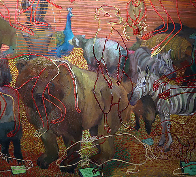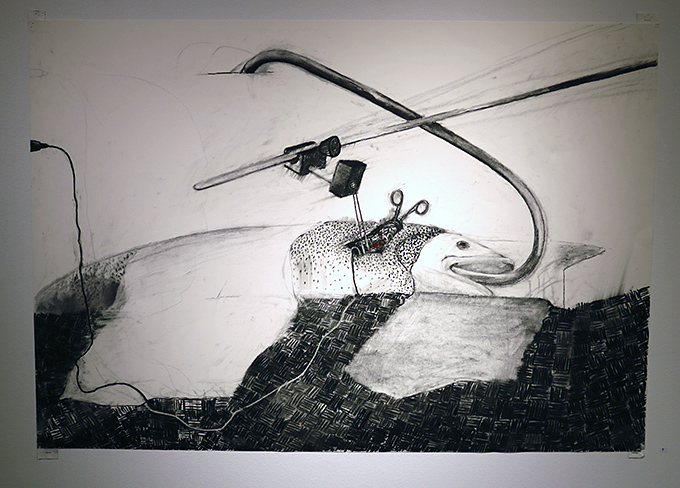 På den här utställningen visar hon en målning och ett antal stora teckningar, med uppstoppade djur och experimentdjur som motiv. Hon är verkligen en suverän tecknare. Det är som om hennes ritstift fångar och återför det liv som lämnat de döda djuren. Hon tecknar med en saklighet som inte objektifierar utan för nära. Det är som hennes tecknarhand för linjerna mot något odefinierat obestämt, lika ogripbart som väsentligt.