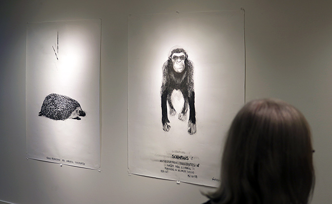 På den här utställningen visar hon en målning och ett antal stora teckningar, med uppstoppade djur och experimentdjur som motiv. Hon är verkligen en suverän tecknare. Det är som om hennes ritstift fångar och återför det liv som lämnat de döda djuren. Hon tecknar med en saklighet som inte objektifierar utan för nära. Det är som hennes tecknarhand för linjerna mot något odefinierat obestämt, lika ogripbart som väsentligt.