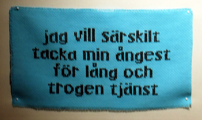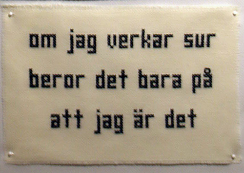 Det är väl egentligen ett slags galghumor. Man kan skratta åt motgångarna. Och de får sitt rätta värde av garvet. I PR-materialet för utställningen heter det att vi får se ett 60-tal utvalda käftsmällar i korsstygn. Så sant som det är sagt. Men av hennes käftsmällar ser man inte stjärnor, utan man ser klarare. Och det är väl det som är det fina i kråksparken.