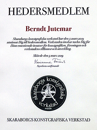Bernt Jutemar har många strängar på sin lyra. Han var intendent för Skövde konsthall i slutet av 60-talet. Tog initiativ till, och byggde, under 80-talet upp Skaraborgs Konstgrafiska Verkstad i Skövde. Det ovärderliga arbetet skapade en grafikverkstad som är mycket utnyttjad och mycket uppskattad av många. Han blev föreningens första hedersmedlem 2019 med motiveringen: –”Verkstaden önskar tacka Dig för Dina enastående insatser för konstgrafiken. Föreningen och verkstadens tillkomst och utveckling.”