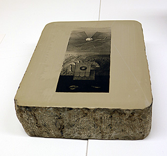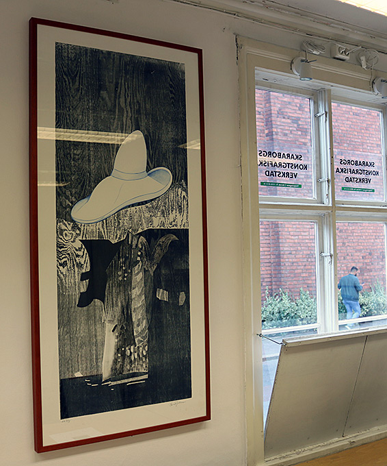 På utställningen kan vi också se en litografisten med motivet kvar på. För oss lekmän är den, fast den bara är en del i arbetsprocessen vacker som ett konstverk i sig. Det är också typiskt för Bernt Jutemar att ta med den på utställningen. Han är en entusiastisk pedagog och grafikambassadör i alla lägen. De bilder vi får se här är de enda stenlitografier koppargrafikexperten Bernt Jutemar gjort. Den generösa gåvan kompletterar Skaraborgs Konstgrafiska verkstads samling på ett fint sätt.