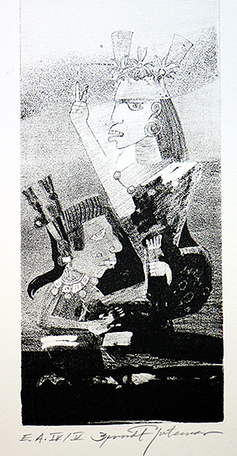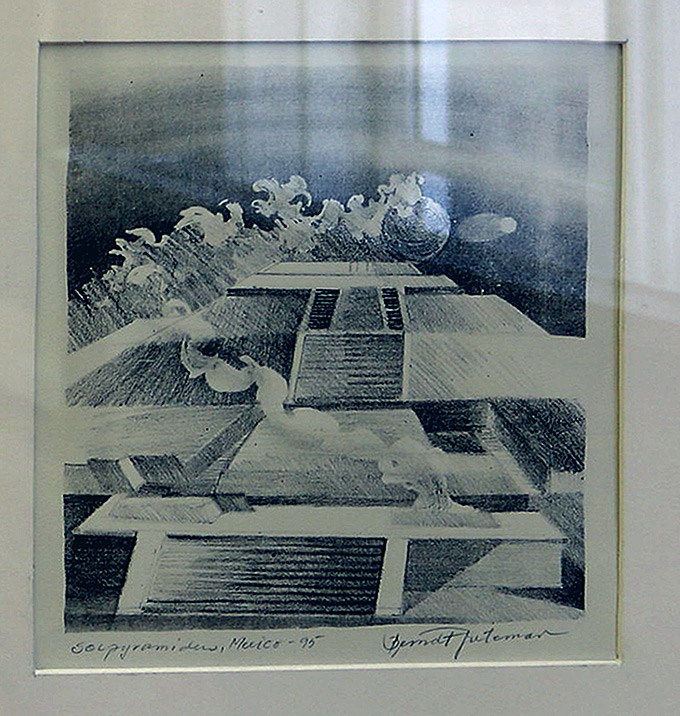 Bernt Jutemar är en konstnär som kombinerar naturvetenskap och konst i sitt skapande. Som tidigare lärare kan han sin naturvetenskap och dess metoder. Det märks förstås tydligast i hans geometricerande verk där antik filosofi möter analytisk geometri och i mötet uppstår de speciella konstbilder han kanske är mest känd för. Men när han möter den mexikanska kulturen sätter han sig in i dess kulturhistoriska förutsättningar. En mexikansk zikkuratanläggning lockar till en bild med sin intrikata konstruktion. Men han har också gjort bilder ur mexikansk mytologi, som han bland annat stött på museibesök på plats. Bilderna är små till formatet och som alltid när det gäller Bernt Jutemars bilder tekniskt drivna, även i den här tekniken.