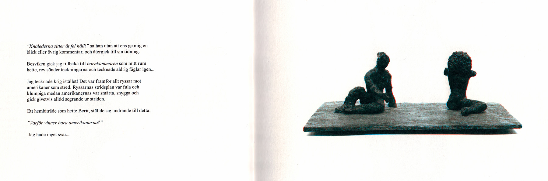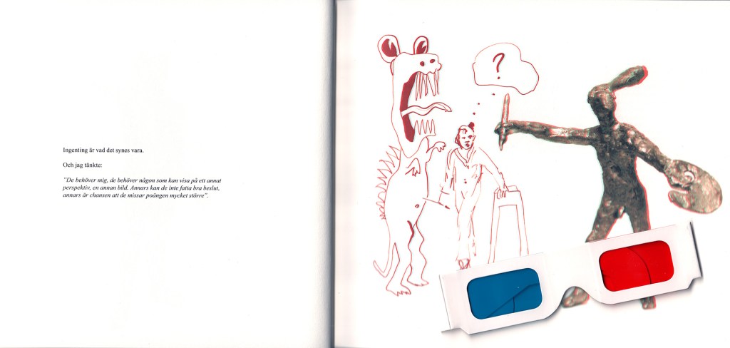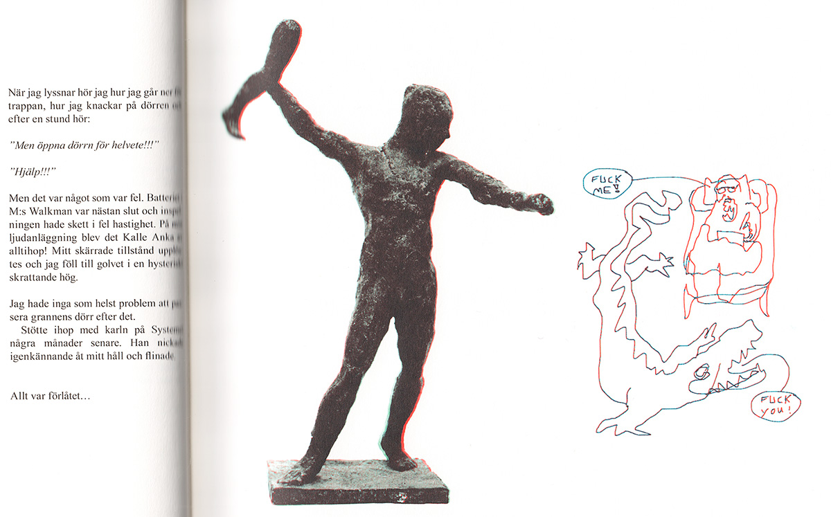 Utställningen på Vandalorum, och också bilderna i boken, ska ses genom 3D glasögon. I boken handlar det om att ge de avbildade skulpturerna volym fast de är platt avbildade på sidorna. Och det kan fungera. De blir tredimensionella fast de inte är det. Eller är det det dom är. It`s all in your head.