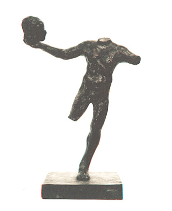 De här skulpturerna ser ok ut. Nån av dom skulle väl kunna fungera bra som pris. Riktigt bra. Annars är det litet lättsurrealistiskt, med människor med djurhuvuden och t ex en man med sitt eget huvud, inte under armen, men i handen. Och en gubbe som doppar huvudet i en hink. Den tycker jag ska bli prisstatyetten. Några av texterna handlar om (mar)drömmar och oförmodade möten och om döden.