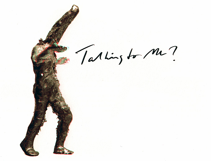 Efter en rad kluriga noveller om ditt och datt kommer nåt mot slutet. Han berättar att han fått förfrågan om att göra en liten Oscarsstayett. Och han provade, f d skulpturprofessor som han är. Han hamnade i ett kreativt flöde han trivdes i. Och så det obligatoriska konstnärsflummet: ”Var kom de ifrån? Fanns de redan där i vaxet? Det kändes så.” Han tycker sig dessutom hitta en röd tråd mellan de här skulpturerna och sina installationer. Och varför inte? It’s all in your head. Delat ansvar är dubbelt ansvar. Delad glädje är dubbel glädje.