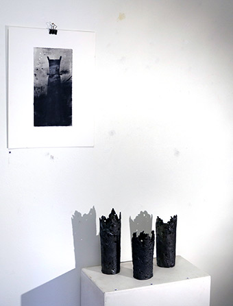 På den här utställningen visar hon ett antal arbeten i rakubränd lera. Rakubrända kärl utmärks av sin opretentiösa enkelhet. Leran blir vid bränningen grå eller svart. Ytan krackelerar. Ibland metalliseras glasyren till hårda glanser. Gunnel Vallhagen har berättat att de uttryck som kunde skapas i rakubränningstekniken för henne blev ett sätt att synliggöra, och därigenom kunna bearbeta sårbarhet och förfall. När glasyren metalliseras och blir hård, blank och stark, kan det upplevas som en möjlighet, att det finns hopp och nya, oväntade möjligheter.
