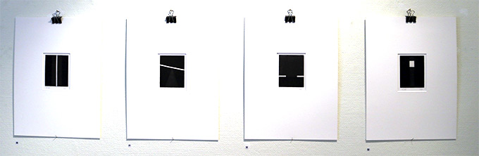 På en utställningsvägg hänger en serie grafiska blad som till skillnad mot mycket av det andra i utställningen har en mera rätlinjig estetik. Konkretismen brukar vara kall och strikt. Men här känns de hårde linjerna milda och mjuka.