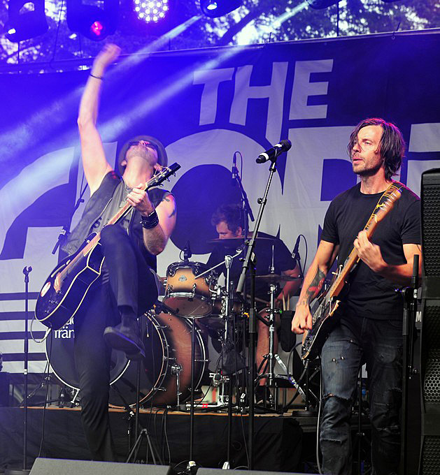 gitarr falla sammanlagt fem gånger mot scengolvet. Den sista gången splittras
