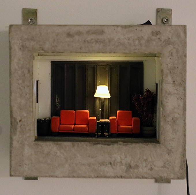 Konstnären är Martin Skimutis. Han skapar ödsliga platser där våra tankar rådbråkas om de vågar sig in. Vi ser ensliga miljöer, en busshållplats, en gatlykta och några träd. Miljön är liksom bruten ur sitt sammanhang och vi ser även rötter och annat underliggande. Eller en rumsmiljö inramad i ett massivt ramverk av betong. Mänskliga miljöer, men inga människor. Vi ser dem och deras frånvaro pockar på svar. Det känns om allt är borta och taget ur sitt sammanhang. Dött!? I så fall är det en död i märklig skönhet. Det här är verk som laddar tystnaden och fyller den med frågor, snarare än svar. De viskar högt.