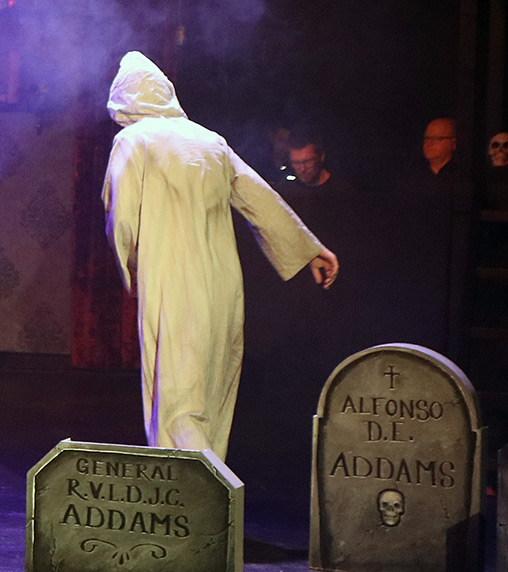 Man såg direkt att det här blir bra. Scenrummet var verkligen intressant. Ett bra rum med orkestern på scen på ena kanten. Och så fina slottsmiljöväggar med dödskallar och en fågelbur med en död fågel. Och så en tom spelplats med bara några gravstenar på kanten. Det stack fram vita händer som knäppte den omisskännliga Familjenaddamssignaturen. När man hör den blir man garanterat på bra humör, även om det ser litet otäckt ut. För in på övre scenkanten väller ett gäng likbleka förfäder in. De uppmanas att gå därifrån och hem igen, men det kan de inte för det är någon i Familjen Addams som blivit kär i en vanlig och så länge det pågår är dörren till dödsriket stängd och de kan inte gå hem till sig. De fanns med på scenen hela föreställningen och bidrog på ett effektfullt sätt med sång, dans och ordlösa kommentarer till det som skedde på scenen. Det var ett bra dramaturgiskt grepp.