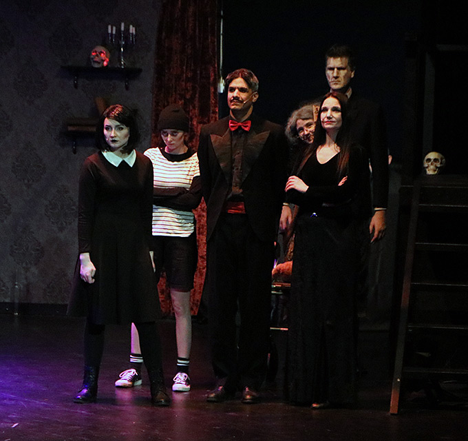 Dennis Sanderheim är en tangokavaljer som har koll på läget. Hans Gomez blir en kul en, med ett stort känsloregister och ett kongenialt minspel. Han fyller sin typ med liv och lust. Och hans sångnummer är riktigt bra. Morticia, frun i familjen, spelas i en kombination av maktlysten bitchighet och lightsexighet på ett coolt sätt av Nina Tågerud. Lillevie Peterson gör den förälskade dottern som är både kaxigt trotsig och rosenskimrande förälskad till en levande karaktär. Och Axel Andersson gör hennes pojkvän till en trovärdig hedersknyffel och svärmorsdröm. Scenen där hon med förbundna ögon ska skjuta ett äpple från hans huvud med sitt armborst är hjärtkrossande.