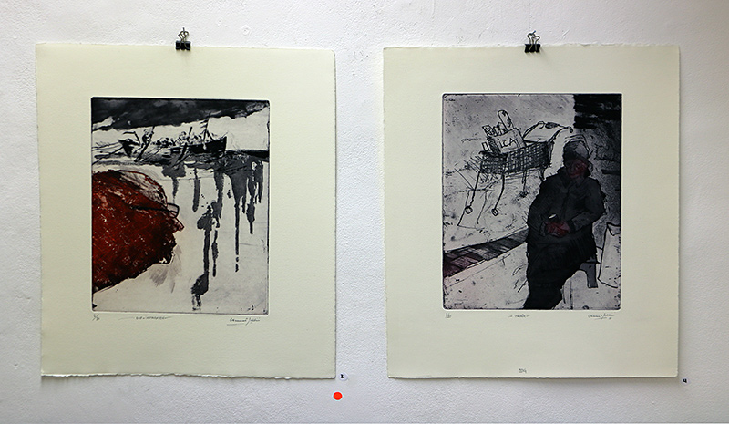 Chennet Juhlin två fina etsningar. Självporträttet Iakttagaren är ett suveränt blad av en Juhlin i högform. Och Bilden av tiggerska visar att han inte släpper sitt politiska och sociala engagemang.