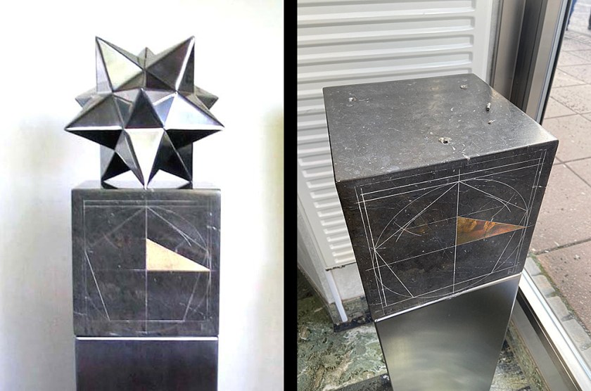 Verket heter Stjärnlik Dodekaeder och är gjort av skutören och mästargrafikern Berndt Jutemar. Den är en tredimensionell stjärna med 12 sidor. Dess form utgår från en av Platons regelbundna kroppar, den som kallas etern. Skulpturen är ritad ock konstruerad av Berndt Jutemar som ofta använder geometriska former och konstruktioner med konst- och kulturhistoriska konnotationer i sina arbeten både som skulptör och grafiker. Det nu stulna och skändade verket är ca 30 centimeter hög och gjord i rostfri plåt i en fantastisk finish. Det stod placerat på en vacker sockel i mörk sten med en förgylld triangel infräst.