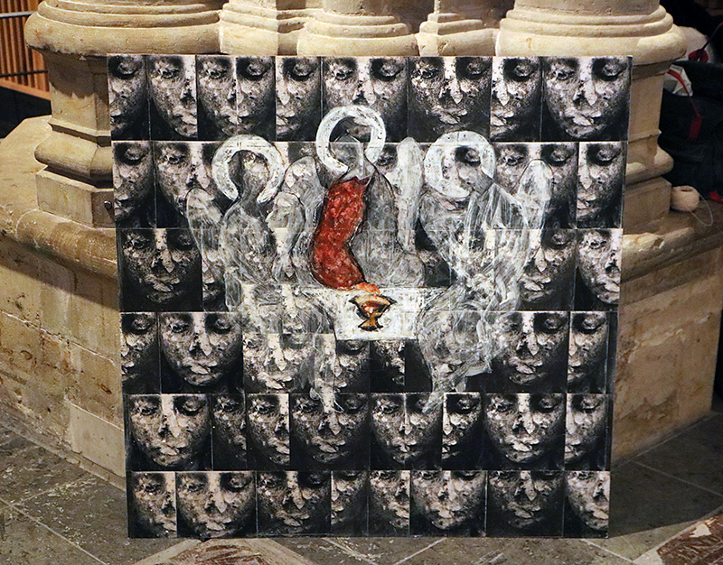 Tommy Westbergs bilder har ett självklart viste i Skara Domkyrka. De handlar om kristet religiösa frågor och ger bilder av tankar och begrepp i en personlig gudstro. Och de har ett lågmält bildspråk som avviker och därför spelar med, eller ska man säga mot, domkyrkomiljöns överväldigande storhet.