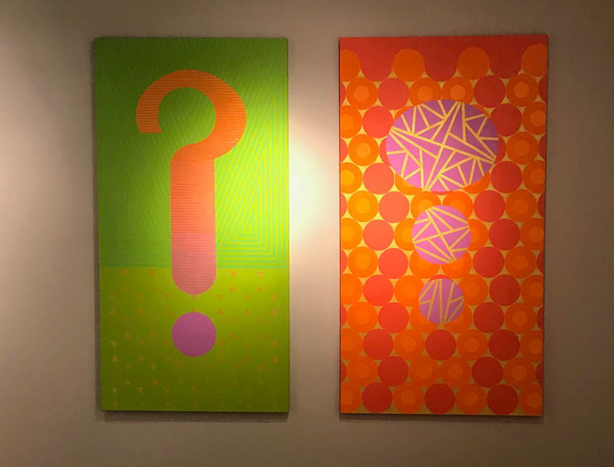 Hon nöjer sig inte med det dekorativa. Mot ett randigt grundmönster av en typ som bara finns i konsten är två figurer, tecken, pålagda. Det vänstra ser ut som en stiliserad variant av Monets solnedgång, ni vet en punkt med en lång skugga i vattnet. Det för tankarna till harmoni och stillhet. Men Rantanen vill själv med sina kommentarer föra tankarna mot Eduard Munchs bild med en liknande form. Då blir det mer psykologi och allvar. Till höger har hon vänt på samma figur. Då ser vi ett utropstecken (eller upprorstecken som hon klurigt säger själv). Med hennes hjälp får man en intertext. De enkla tecknen målar upp ett möte mellan en naturupplevelse och en ikonisk kulturell symbol och det retar både tanke och känsla. Och det ger stiliga målningar.