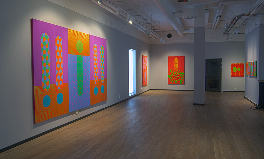 Hon gör ibland mönster som kombinerar modernismen motstånd mot ornament med en nästan barock ornamentik. Hon är respektlös på ett respektfullt sätt. Hennes målningar har alltid ett mönster i botten. Och det ger en textil känsla. Och så bryter hon på finska. Och djupsinnigare än så är inte konstkritiker än att det står om Marimekko i stort sett varje recension av hennes konst. Tja, hon säger det ju själv, så varför inte? Men inte ger det mig någon öppning till verken längre.
