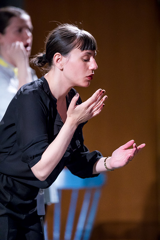 Det blir något märkligt när skådespelarna ska gestalta en text eller ett statement och inte levande människor. En av dom deklamerar och så står dom andra och gör rörelser som ska illustrera. Det blir som ett slags charader där man redan vet svaret, för gåtan är ingen gåta. När nån talar om att duscha utförs en masspantomim där de andra aktörerna illustrerar hur kroppen tvålas in och håret tvättas. Och när det handlar om en fågel står gruppen och viftar med armarna upp och ner. Och så sker det gång på gång i olika scener. Jag förstår inte poängen. Kanske var det kul första gången. Men fjärde och femte…
