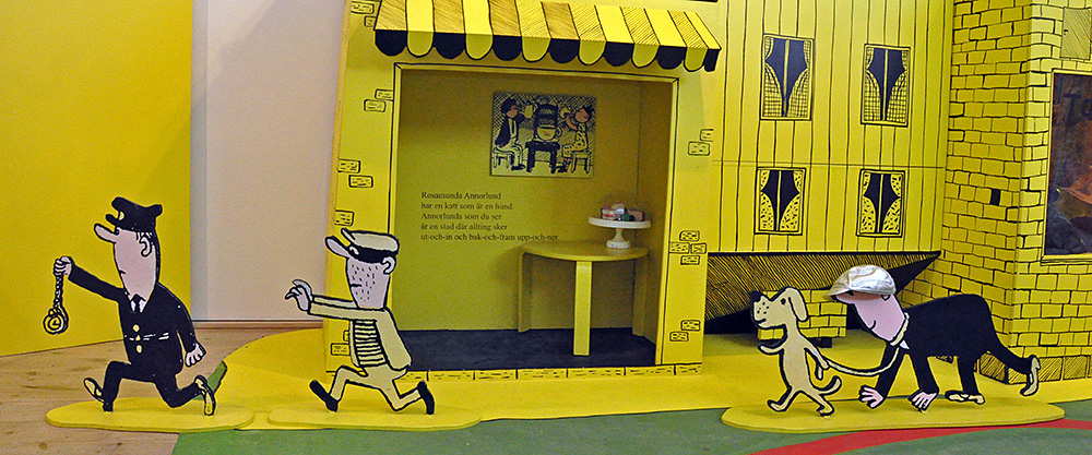 Och givetvis är bilderboken en konstform. Lennart Hellsings ordkonst har lockat flera ”vanliga bildkonstnärer” att skapa bilder till hans böcker. Så här rakt upp och ner kommer jag på; Ulrica Hydman-Valliens Kattbok och Tommy Ösymars Bananbok. Men det finns säkert flera