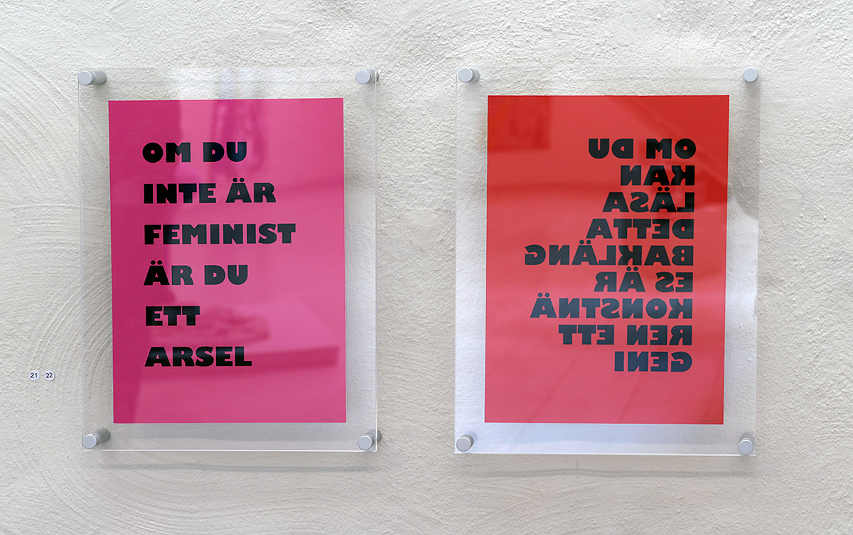 Jag avslutar med ett utropstecken! Marianne Förars Gustafsson två affischer. En stentuff och en halvrolig, en som är själva tecknet, den andra kontrapunkten. Lekfull och kanske just därför slagkraftig feministisk agitprop. Jag använder aldrig ordet käftsmäll, men gjorde jag det skulle det kanske vara användbart här i allt estetiserandet.