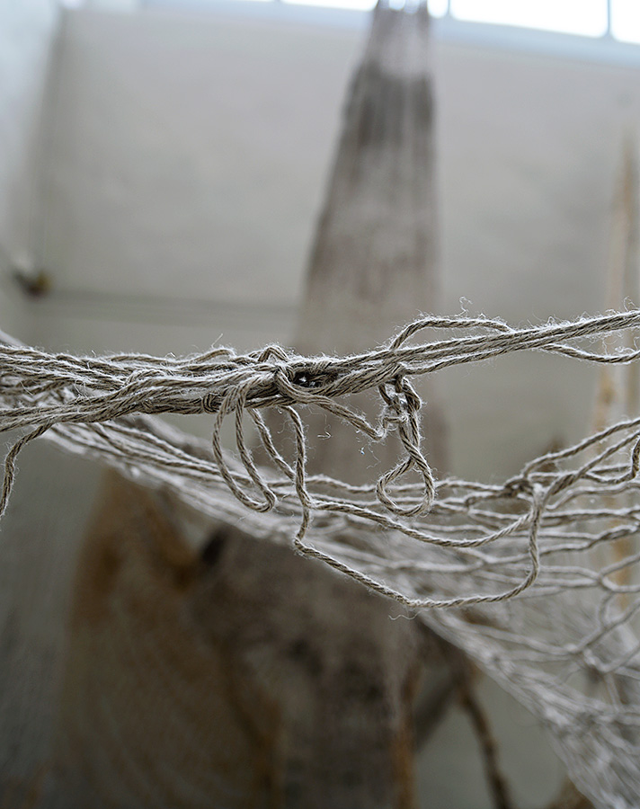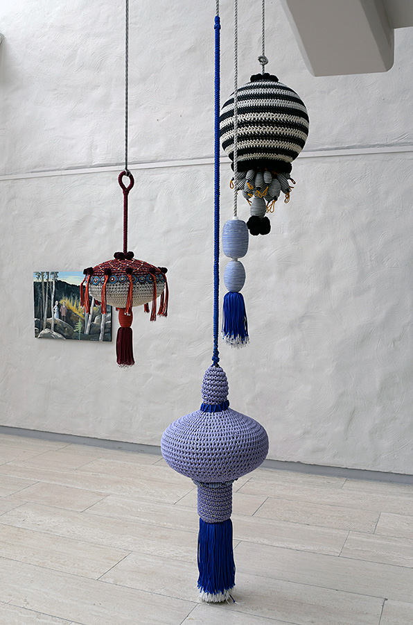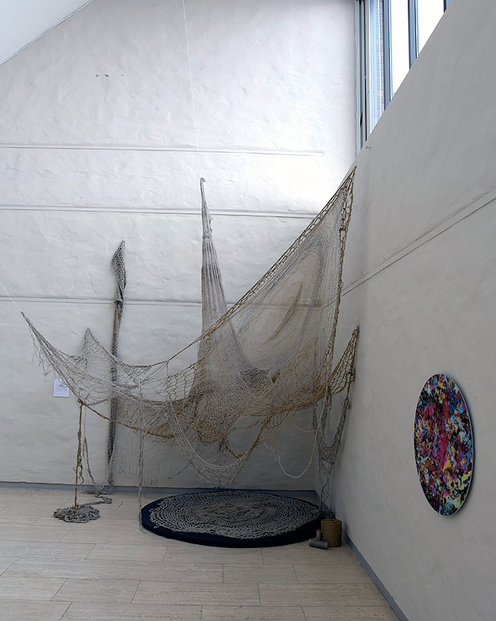 Det finns många arbeten i textila material. Berit Stennabb visar en virkad installation. Bra att virkningen träder fram på ett sätt som känns i tiden, åtminstone för mig. Det är ett mycket stort verk som ser ut som trasiga fiskenät på tork. Verket har konceptuella anspråk också. Dessa framgår väl inte direkt av verket självt, men beskrivs i en skylt som hör till.