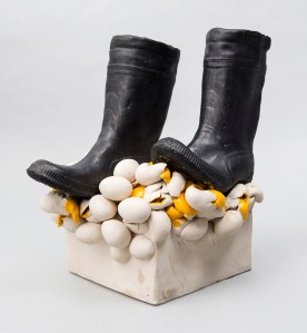 Flera verk visar hur hårt och okänsligt vi människor exploaterar naturen, att vi sätter igång irreversibla processer där vi förstör utan återvändo. Skulpturen Skapelsens krona I Glaserat stengods från 1970 av Britt-Ingrid Persson (f 1938) är ett exempel på slagkraftig protest mot hårdexploatering. Ett par stövlar klampar in i äggskal så vi nästan hör det obönhörliga krasandet. Det är lättare att göra en omelett än att återskapa äggen.