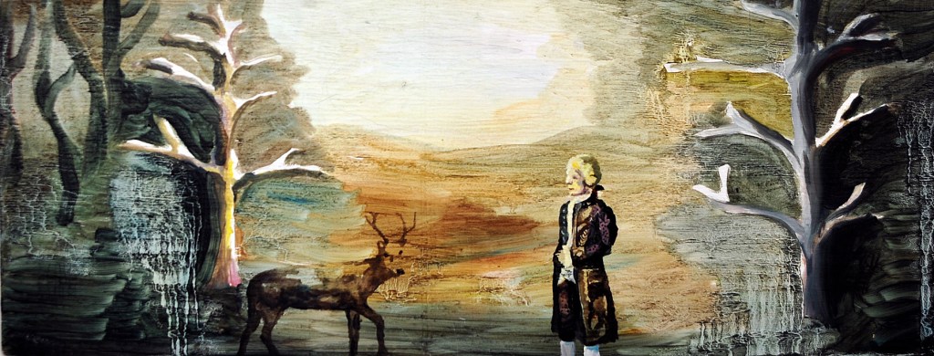 Det handlar om ett starkt bildfabulerande. Några är berättande scener från forna tider, kläder och peruker för mina associationer till sjuttonhundratalet. Tidsresan ger dramat allmängiltighet. Och brunsåsigheten är en tidsmarkör. I en av bilderna står en man och tycks ha fått ögonkontakt med en hjort. Vad händer egentligen? Närkontakt? Tankeöverföring? Träden sträcker frågande ut grenarna.