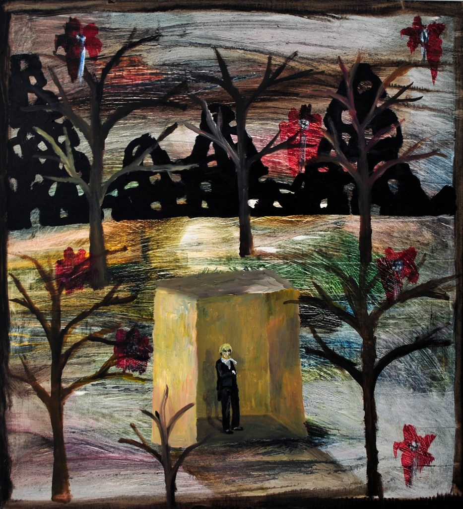 I en annan av bilderna står en man i en låda. Han ser outsägligt ensam och frusen ut. Inget i den omgivande naturen ser vänligt ut. Det flyger några röda gestalter här och där i luften. Väsen är det ord som klär dem. Allt är målat i en slags naivistisk hardcorestil. Det är genomtänkta kompositioner, men mera i drömmens (eller varför inte fantasins) logik än att de passar in i vardagens perceptionsmallar.