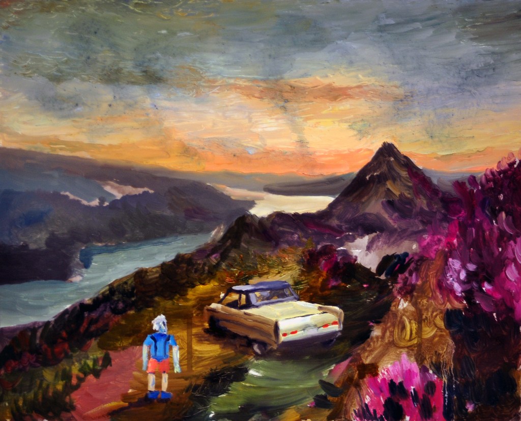 Maurits Ylitalos bilder har litet av det där. Och så något mer. Människorna är små, bilarna med, men naturen är storslagen men på ett sprött sätt. Och i en målning finns en märklig molnformation i form av en bilsiluett.