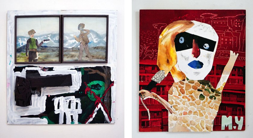 Maurits Ylitalo förknippas med collageteknikens sätt att klippa sönder och klistra ihop nytt. Den stilen går också i några av målningarna med inklippta former.