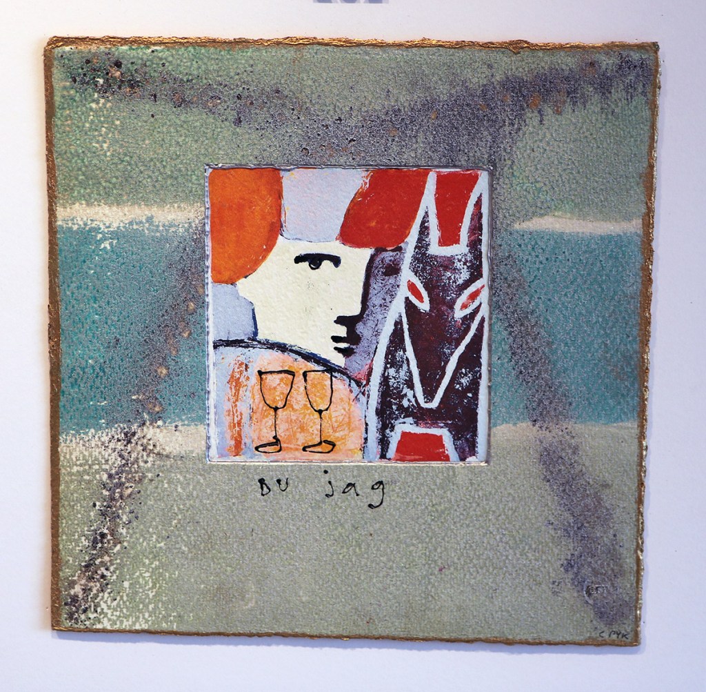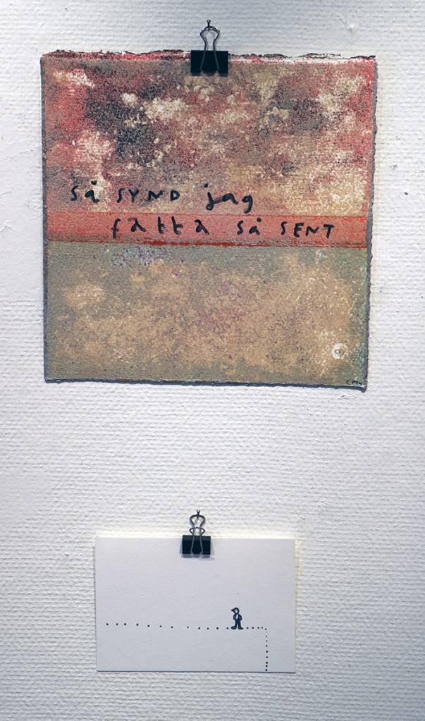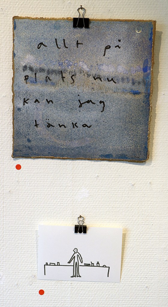 Ett exempel. En blåmellerad yta. På den står skrivet: ”Allt på plats nu kan jag tänka.” Under den bilden sitter en liten teckning med en streckgubbe som sitter på ett tomt skrivbord. En sån bild ger speciella associationer. Jag kommer att tänka på den gamla kontorsdialogen. Nån ser att belamrat och rörigt skrivbord och säger att det ser ut i huvudet som det gör på skrivbordet. Skrivbordets ägare pekar på ett helt rent och tomt skrivbord och genmäler; så är det nog. Så är det väl här. Inga djupsinnigheter i vare sig text eller måleri. Olika konst föder olika tankar.