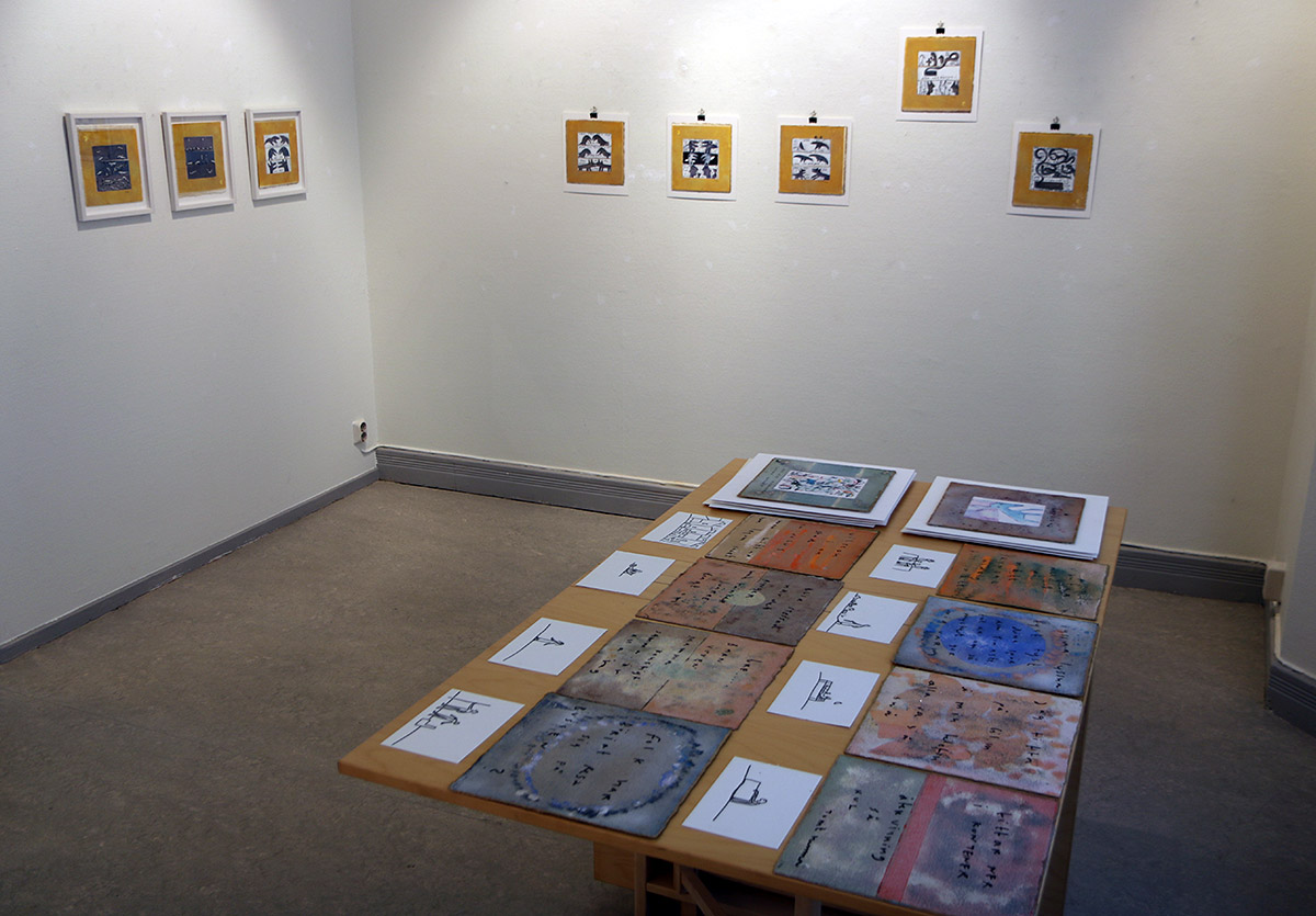 Camilla Pyk gör människor och djur som konturtecknande figurer. De liknar kanske hällristningar, men det finns inget magiskt över dem. Det ser mera litet kul ut. Jag kan egentligen inte se annat än att de är ett sätt att mönstra ytan. Det finns såvitt jag kan se ingen berättelse i själva bilderna. Den finns bara i texten. I ställer verkar målningarna gjorda i helt dekorativa avsikter. Hon arbetar i en blek, återhållen färgskala som jag inte ser ta till vara kolorismens uttrycksmöjligheter. Jag prövar möjligheten att de små figurerna är symboler eller tecken för någon tanke eller känsla. Men jag kommer ingenstans med det.