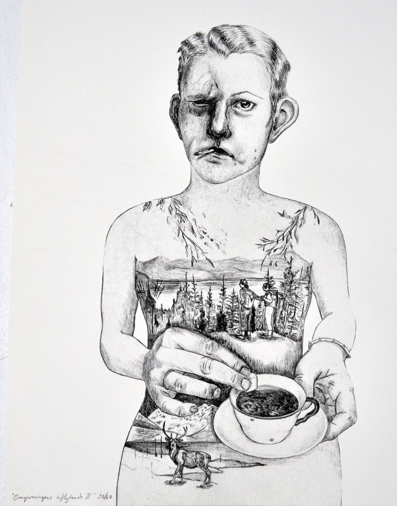 Men först en inledning av konstnären och anti-teoriteoretikern Nina Bondesson. Hon är en konstnär i toppklass och som teoretiker och debattör levererar hon alltid intelligenta, läsvärda och övertygande resonemang som man stimuleras av även om man som jag inte alltid håller med henne. Som i så många sammanhang drar hon sin lans för det hantverksbaserade skapandet och osäkrar sin revolver mot den konst som behöver orden för att få någonting sagt. Fokus ska ligga på den konstnärliga artefakten och vad den själv kan uttrycka och säga oss, inte på reklamtexten om den. Om jag förenklar som en minimalist kan man säga att hon menar att det är det ickeordliga som kan tas fram av konstnären i konstverket som är det viktiga. Vår tid präglas, menar hon, av en övertro på teori. Och det har skapat en skepsis mot det som inte kan beordas. Detta synsätt har skapat en hård motvind, eller kanske snarare ett ointresse för den artefaktbaserade konst som villa få sitt sagt utan ord. Dit vill hon räkna grafiken.