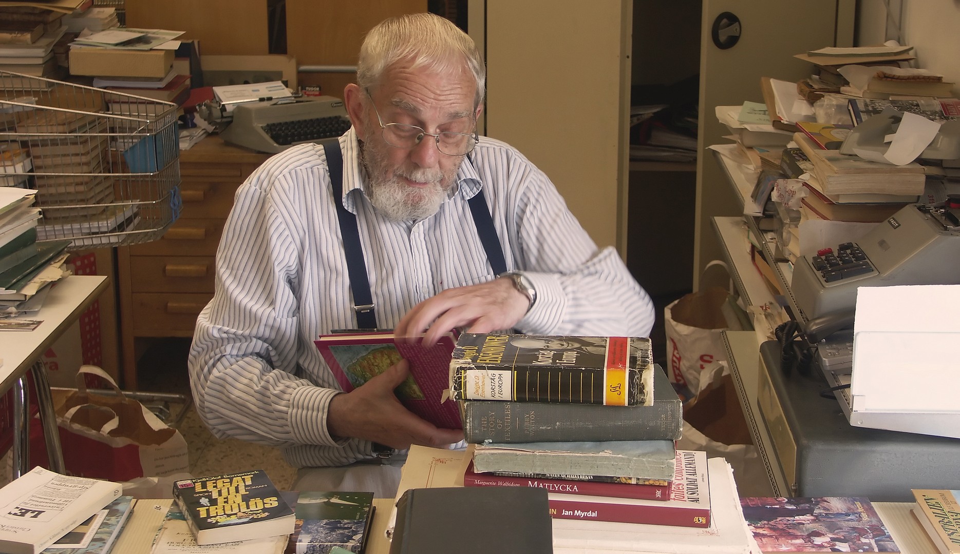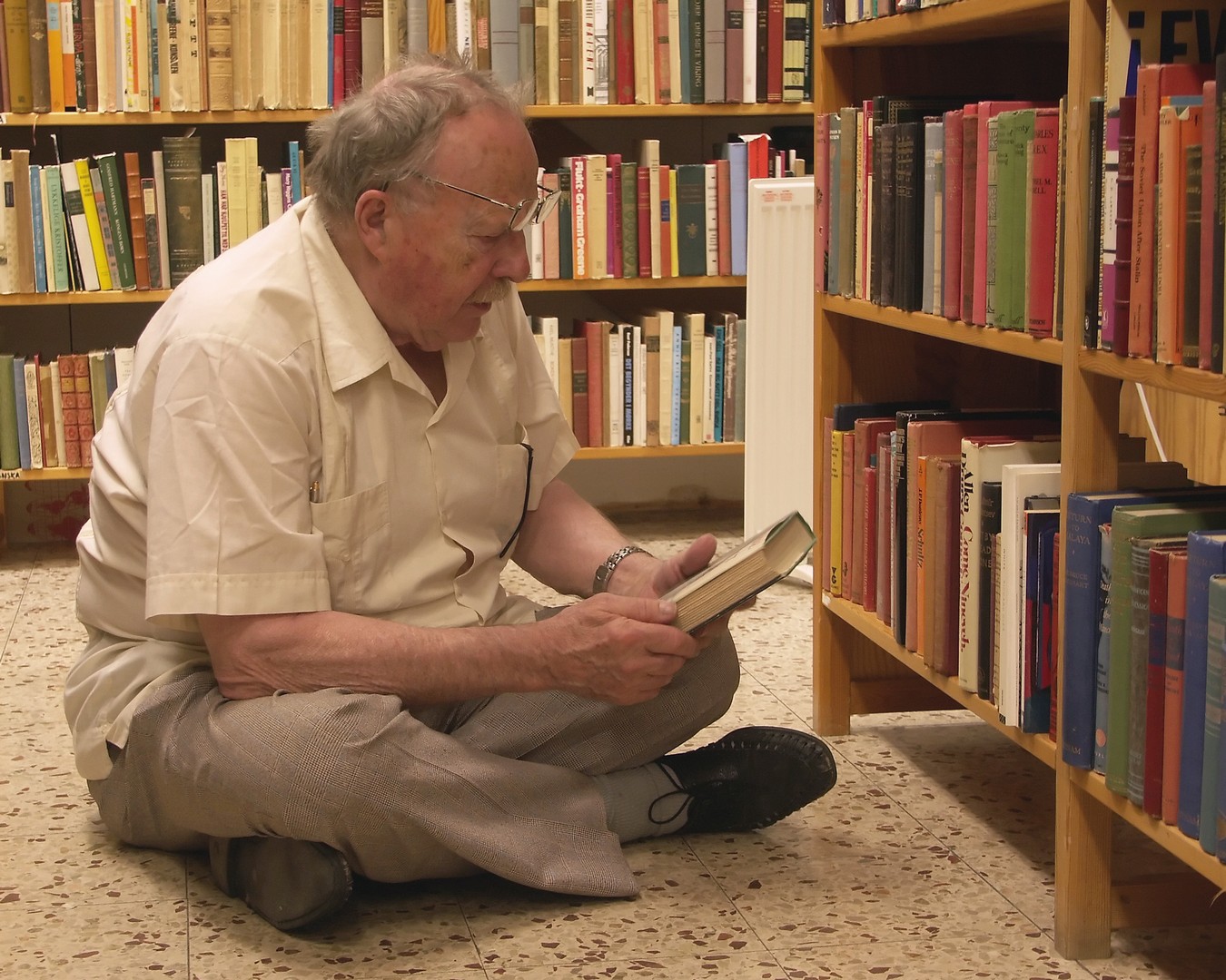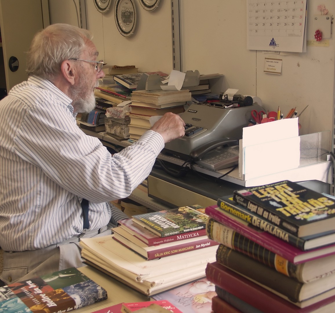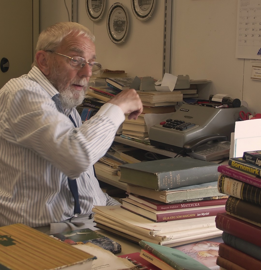 79 år gammal sätter sig Jan Myrdal bekvämt skräddare på golvet för att helt och fullt kunna gå genom nedersta hyllplanet. Och inga bekymmer med att resa sig upp. En färdighet han enligt egen utsago hade skaffat sig under sina resor i kulturer med brist på västerländska stolar. Tala om att jag som idag är yngre är avundsjuk. Det var länge sedan jag kunde sitta på huk i timmar i ett antikvariat.