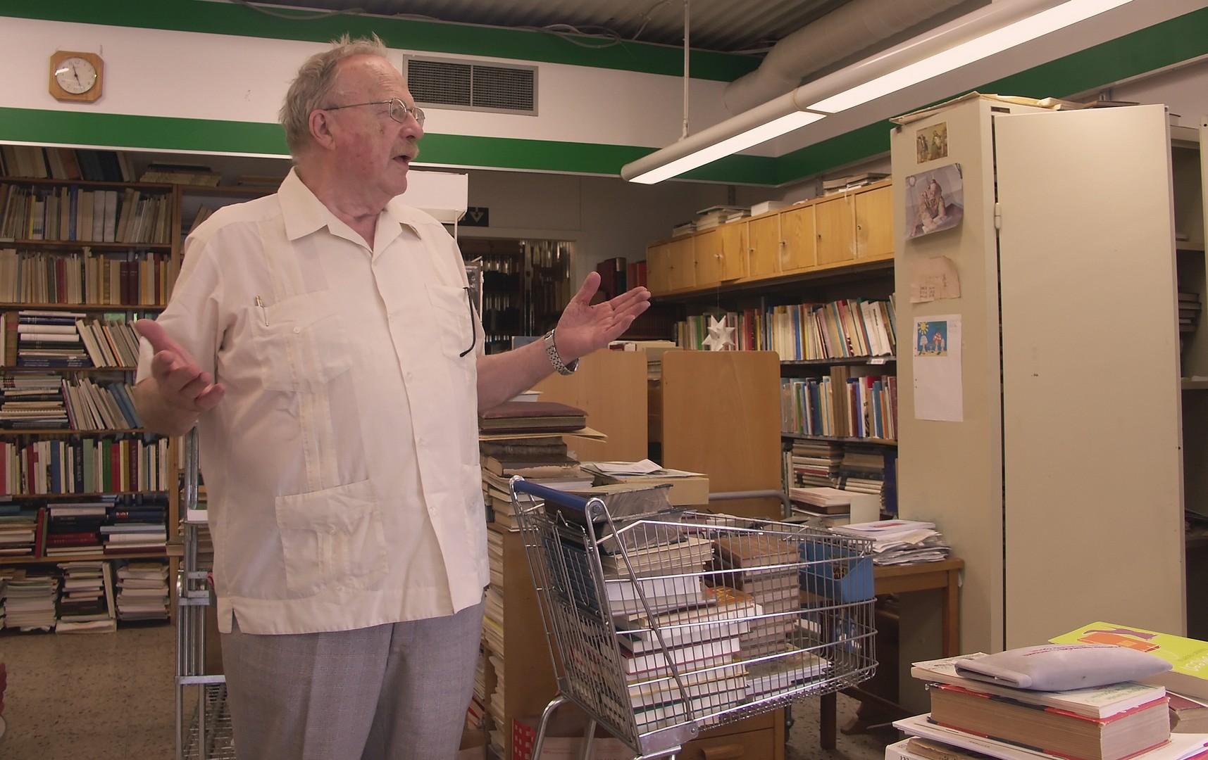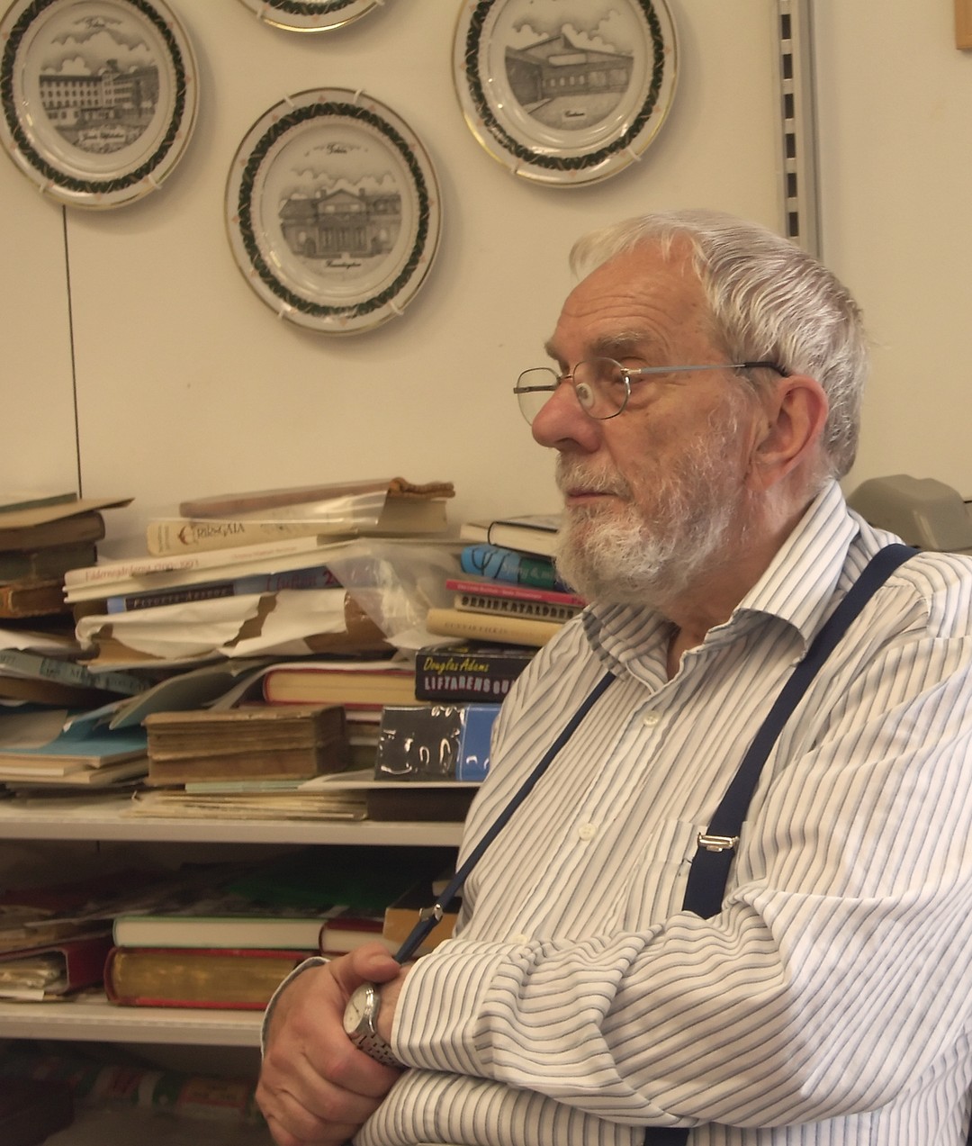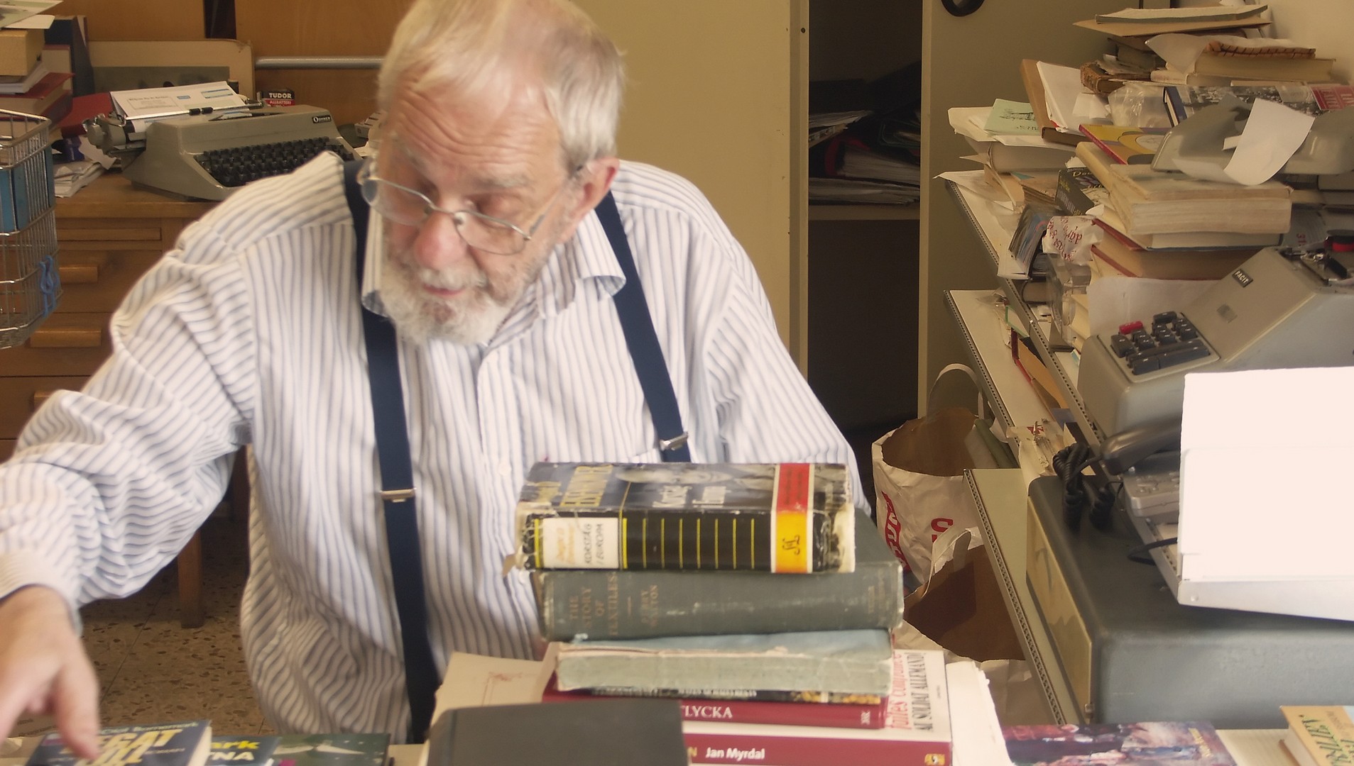 79 år gammal sätter sig Jan Myrdal bekvämt skräddare på golvet för att helt och fullt kunna gå genom nedersta hyllplanet. Och inga bekymmer med att resa sig upp. En färdighet han enligt egen utsago hade skaffat sig under sina resor i kulturer med brist på västerländska stolar. Tala om att jag som idag är yngre är avundsjuk. Det var länge sedan jag kunde sitta på huk i timmar i ett antikvariat.
