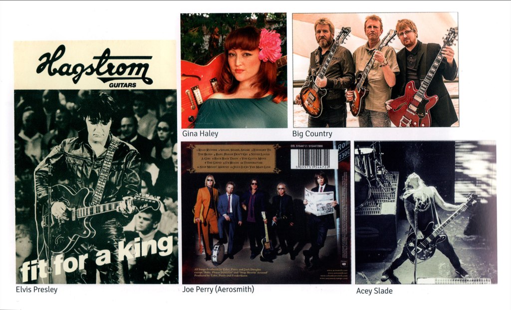 Massor av stora artister har spelat Hagström genom åren. Listan över de artister och grupper som använt deras gitarrer är många sidor lång i boken. Här bara några exempel: Frank Zappa var rena Hagströmambassadören och förekom i deras marknadsföring, David Bowie, John Lennon, George Harrison, Elvis Presley (både i sin Come Back special 1968 och på omslaget till klassiska LPn From Elvis in Memphis) Nirvana, The Eagles, Foo Fighters, ABBA, Jojje Wadenius med många, många flera.