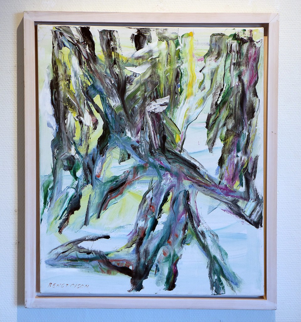 En målning, och det finns bara en på utställningen, av Bengt Olsson blir utan åthävor ett konstnärligt utropstecken. Ett långt och framgångsrikt liv i konsten har fört honom till sitt egna bildspråk. Det är en kraftfull kolorism som ger sig tillkänna i och förstärks av vegetativa former som är bestämda på ett obestämt sätt. Eller är det tvärtom. Det finns många spännande vägar in i Bengt Olssons konst.