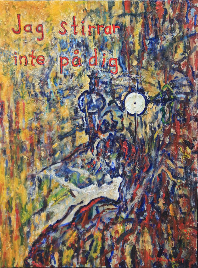 Målningarna handlar om det som han med färg och form kan berätta utöver det litterära, utan att det ska behövas instruktionsboksorerande. Meningarna uppstår i minnets sammansmältande med hans måleri, och sedan i bildens möte med dig.